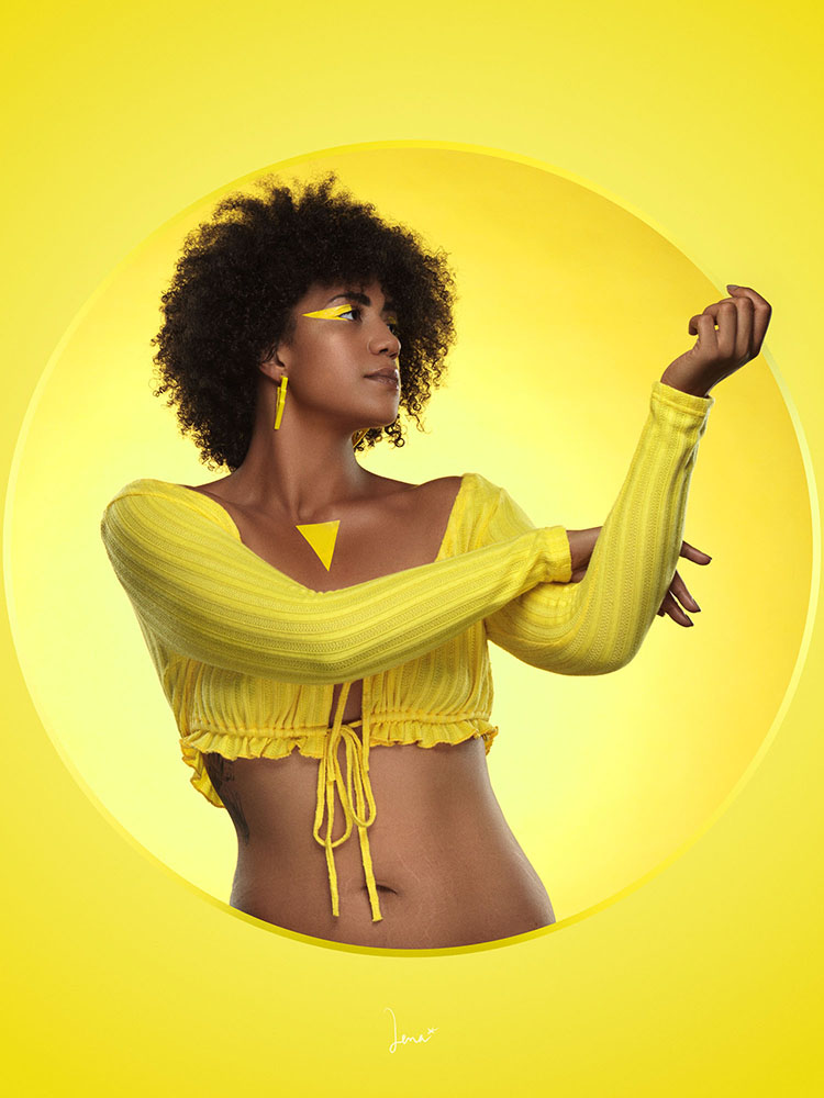 Je défends le travail en équipe ! A ce titre, je voulais que ma collaboratrice d’alors, Julie Girardot, puisse exprimer sa créativité de maquilleuse tout au long des douze visuels. En castant des modèles de tous horizons et avec l’envie d’un casting le plus inclusif possible, nous sommes arrivées à une série de visuels tous différents mais dont l’ensemble est extrêmement cohérent. La série COLORS célèbre les différences en puisant dans des inspirations très hétéroclites. Et puisqu’il s’agit d’une série à message, chacun⸱e interagit avec le cercle qui l’entoure : tantôt timides, tantôt aventuriers ou acrobates, les modèles viennent jouer de cette limite graphique et prennent ainsi possession de cette barrière informelle qui entoure leur photographie.